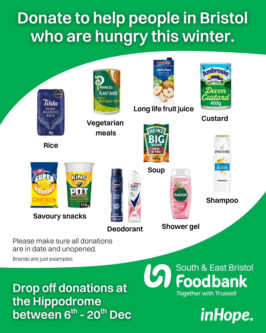 To coincide with the first two weeks of its new pantomime, ‘Jack and the Beanstalk’, Bristol Hippodrome is running a ‘Festive Food Drive’. From December 6 to 20, it will be taking donations for one of our Charity Partners, InHope, a local charity dedicated to helping people in crisis.
